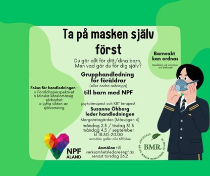 Syftet med projektet är att ge föräldrar/närmast anhöriga verktyg att stärka sig själva och prioritera sin egen självomsorg. Vi vet att det är viktigt att må bra som förälder för att kunna ge bästa stödet till sina barn. Vi vill uppmuntra er att sätta er egen självomsorg i fokus, precise som man uppmanas att sätta på sin egen syrgasmask innan man hjälper andra andra ombord på ett flygplan.
