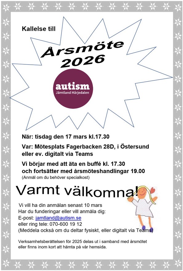 År du medlem och vill skriva en motion till föreningens årsmöte? Då är det dags att sätta i gång och formulera dina tankar och förslag. Senast den 1/3 ska motionerna vara styrelsen tillhanda, via E-post, jamtland@autism.se.