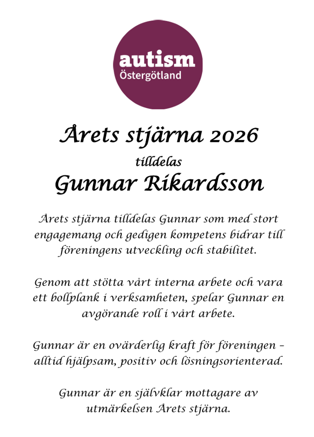 Årets stjärna tilldelas Gunnar som med stort engagemang och gedigen kompetens bidrar till föreningens utveckling och stabilitet.