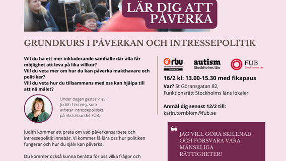 Den 16 februari kommer Autism Stockholms län, tillsammans med RBU Stockholm och FUB Stockholms län, anordna en informationskväll kring intressepolitik och påverkansarbetet.